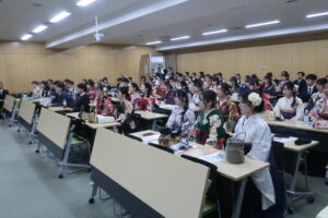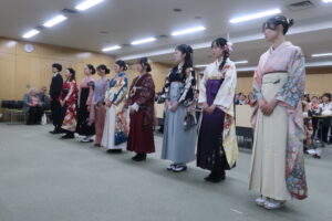 終了後は、ゼミだけでなく、語学クラスや少人数授業で出会った学生さんとも再会し、様々な思い出話にふけることができました。小規模学科ならではの、アットホームな卒業式でした。